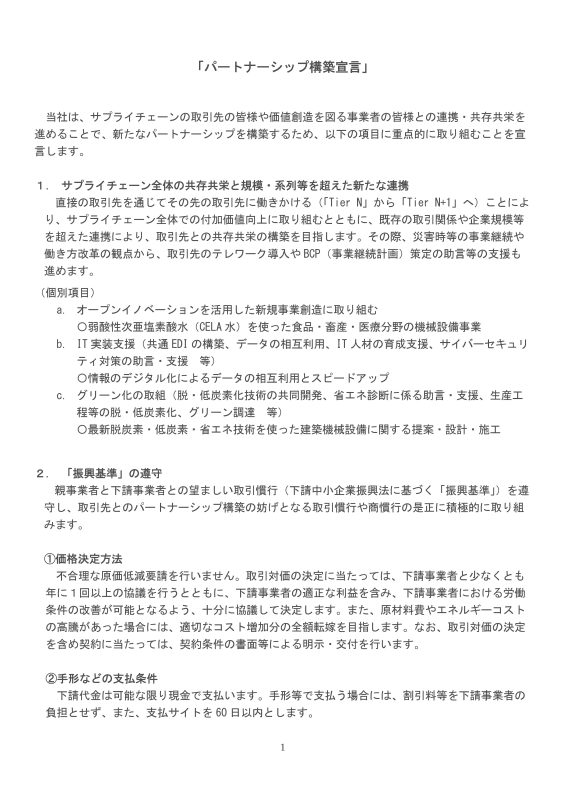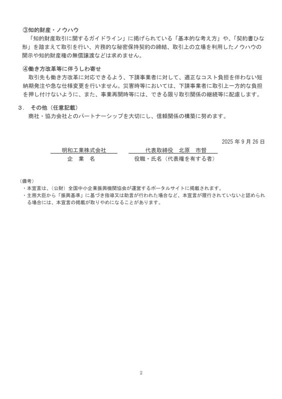 2025年09月26日 弊社が『パートナーシップ構築宣言』を致しました。 お知らせ この度弊社明和工業株式会社は、新規事業創造や脱及び低炭素化事業を見据え、サプライチェーン全体の共存共栄と規模・系列等を超えた連携を創造するために『パートナーシップ構築宣言』を致しました。 これまで以上にサプライチェーンの皆様と協力体制を強め、共に歩んでいきたいと考えます。